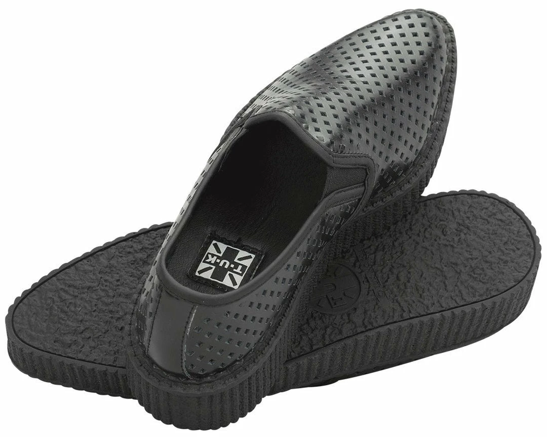 A new style this year at T.U.K. These perforated leatherΒ slip on shoes are a blend of casual, punk, and classy all in an easy to wear combo. The heel height of the solid platform sole is aboutΒ 1.5″