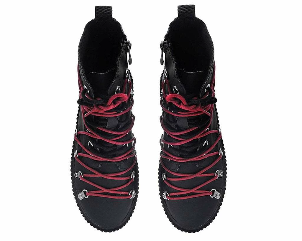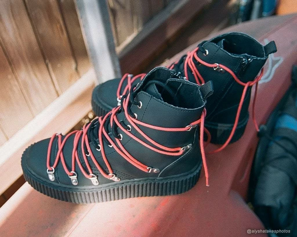Tell ‘em to take a hike in these rad creeper boots. Has an all-black upper with a matte finish complemented by a hiker boot inspired construction with double lace-up featuring black and red shoelaces. Features a platform sole height that is about 1 ½” at the heel and 1” in the front. Includes removable memory foam insoles for added comfort. Vegan friendly and made of all man-made materials.