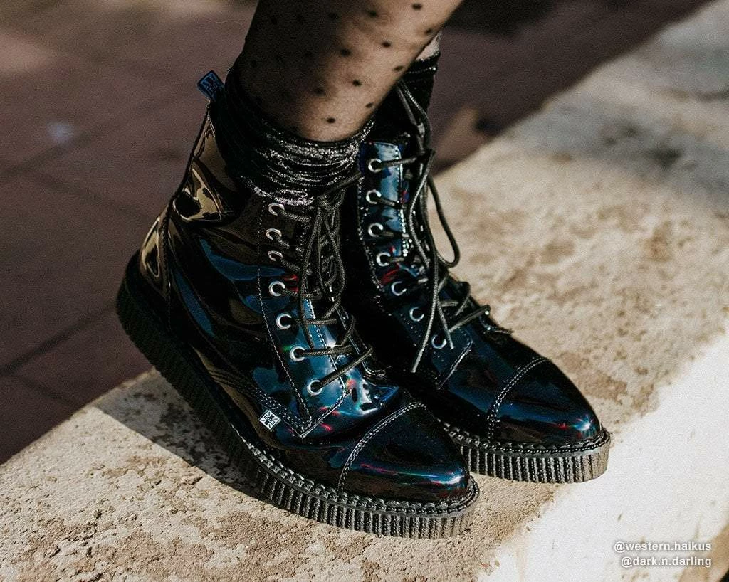 Stomp it out in sharp street style with these killer creeper boots. Features a vegan friendly black holographic upper on a pointed-toe boot construction that adds an instant dose of sleekness. These booties have a 7-eyelet lace up detail and a platform sole height that measures 1 ¼” at the heel and ¾” in the front. Has removable memory foam insoles for added comfort and inside zipper closure for easy on/off.