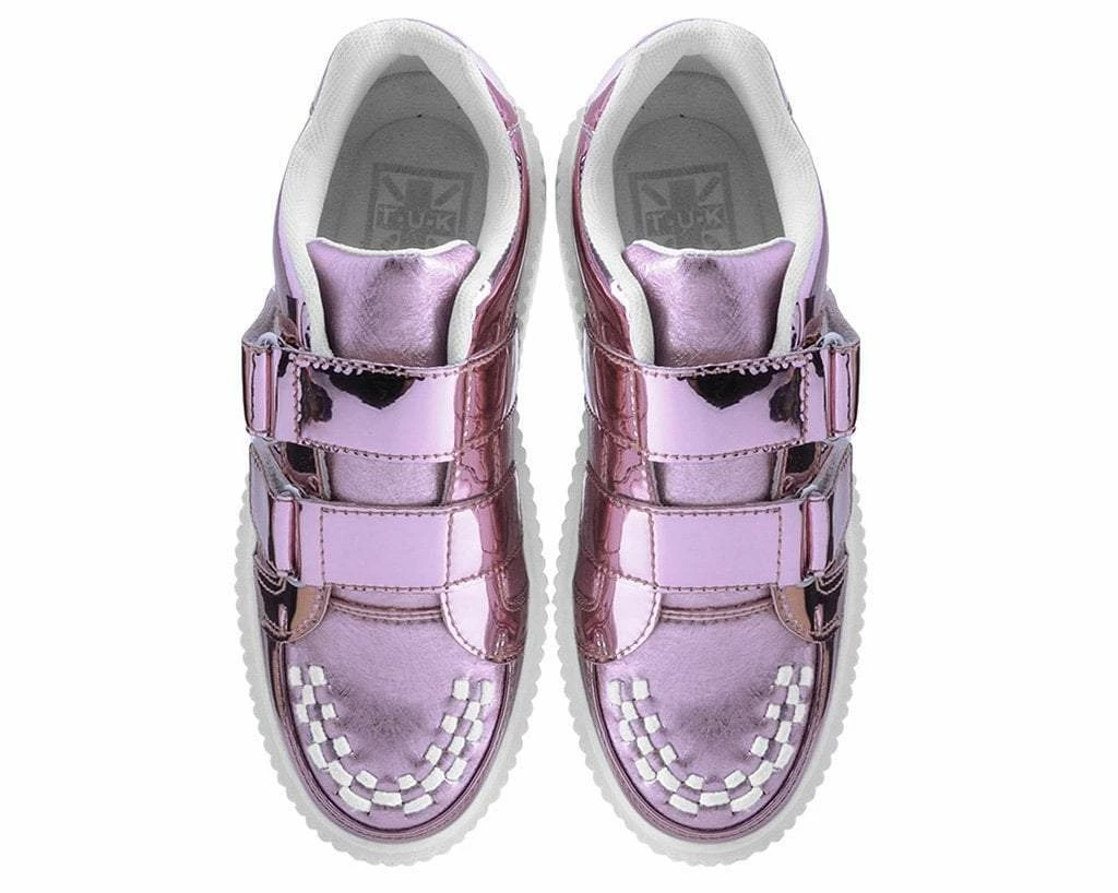 Get your shine on all day long in these bad boys. Catch all the double-takes in these rad creepers featuring a pastel pink metallic upper. Features double Velcro straps for easy on/off wear and has a creeper platform height that is about 1 ยฝโ at the heel and 1โ in the front. Has removable memory foam insoles for added comfort. Vegan friendly and made of all man-made materials.