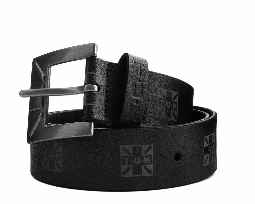 The Black T.U.K. Logo Belt is made of PU faux leather and has a width of 40mm.