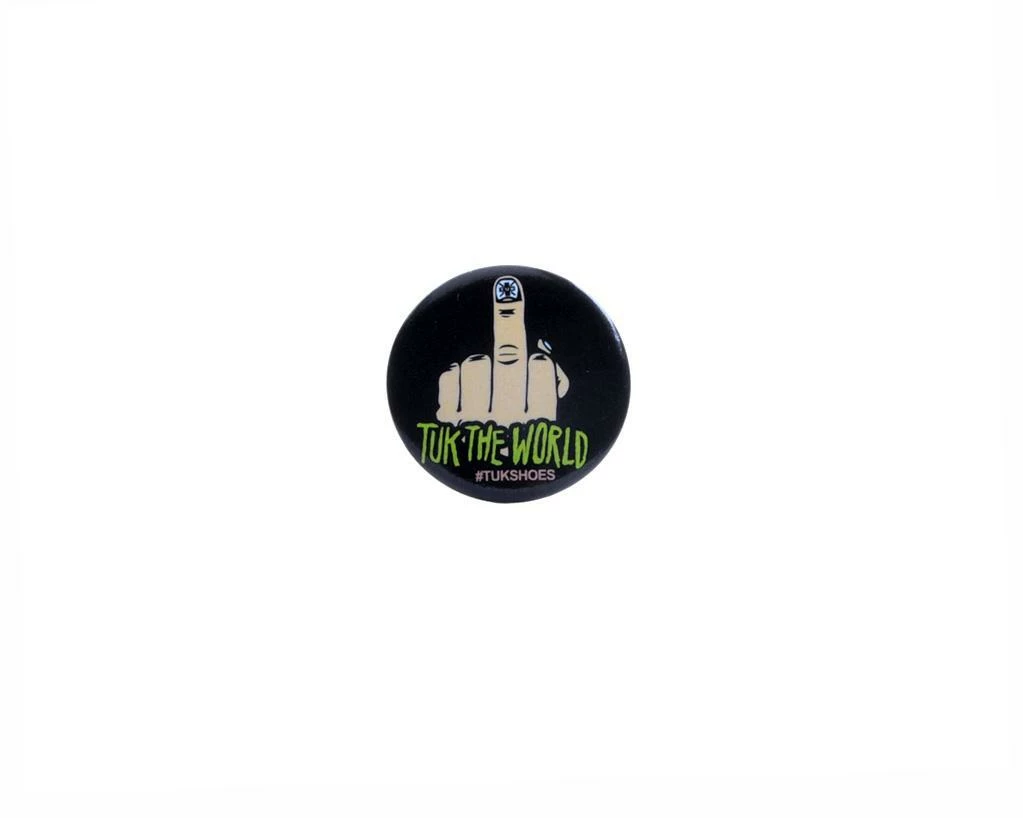 Add a little T.U.K. attitude to your favorite leather jacket, denim vest, or bag with this small black TUK The World Birdie metal pin-back button. Measure approximately 1” wide.