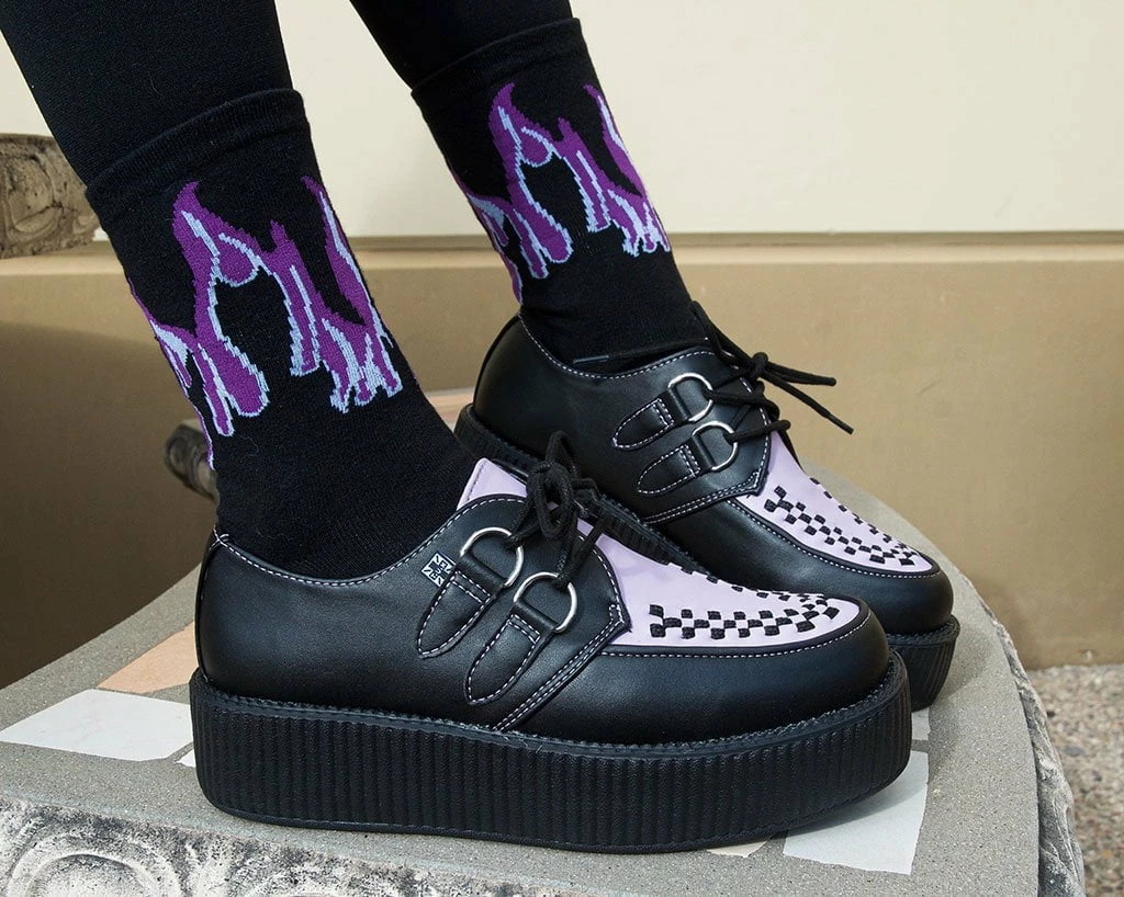 The perfect solemate to your fave pair of creepers. A classic crew sock featuring a purple & grey flame design woven into a black sock