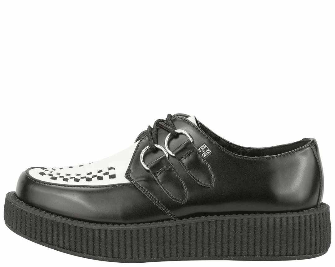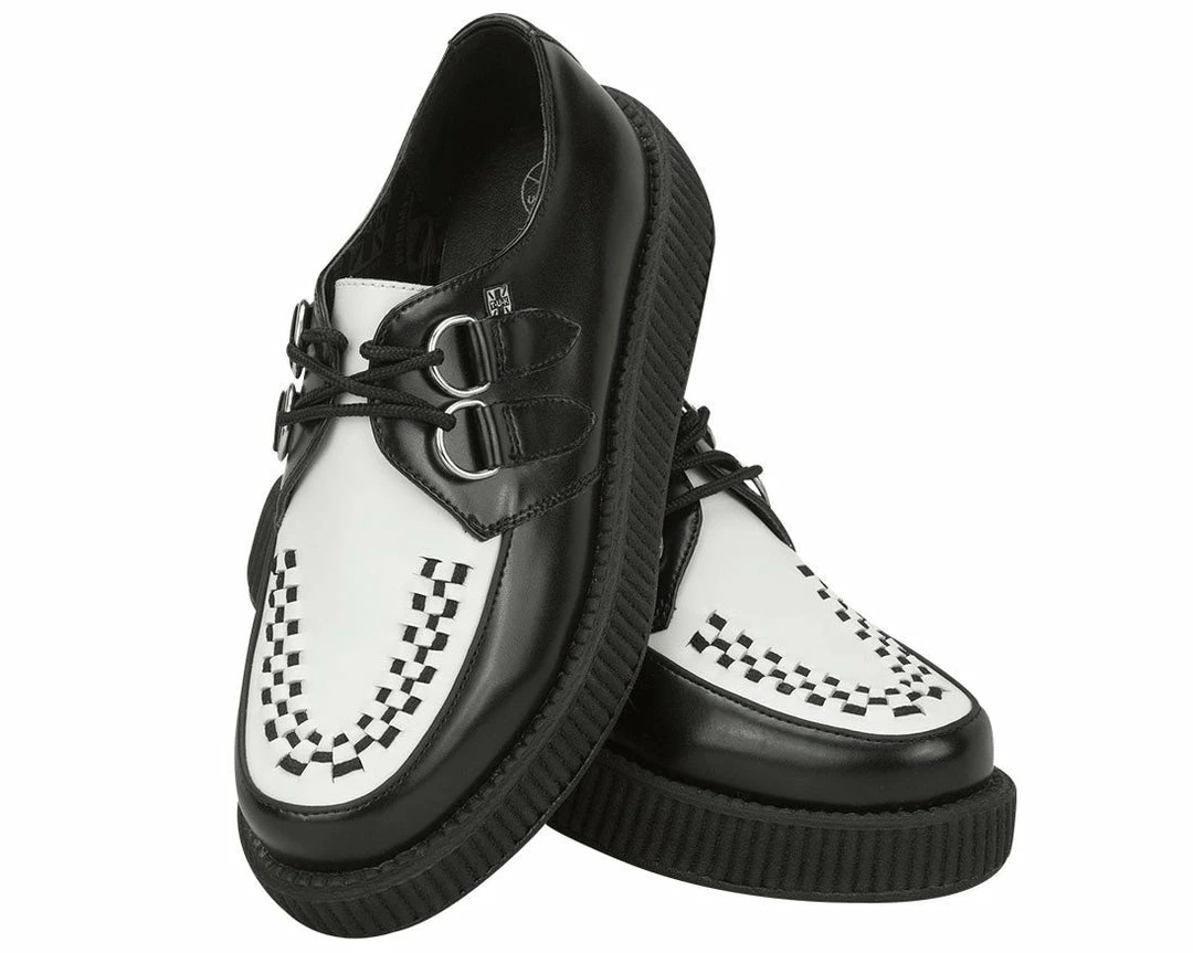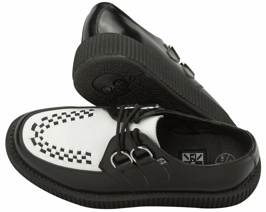 These black and white leather T.U.K. Viva low sole Creepers feature the new lightweight and more flexible soles in our traditional 1 1/2″ low soleΒ height. These creepers have a black woven interlace, and silver metal D-rings.Β Β
