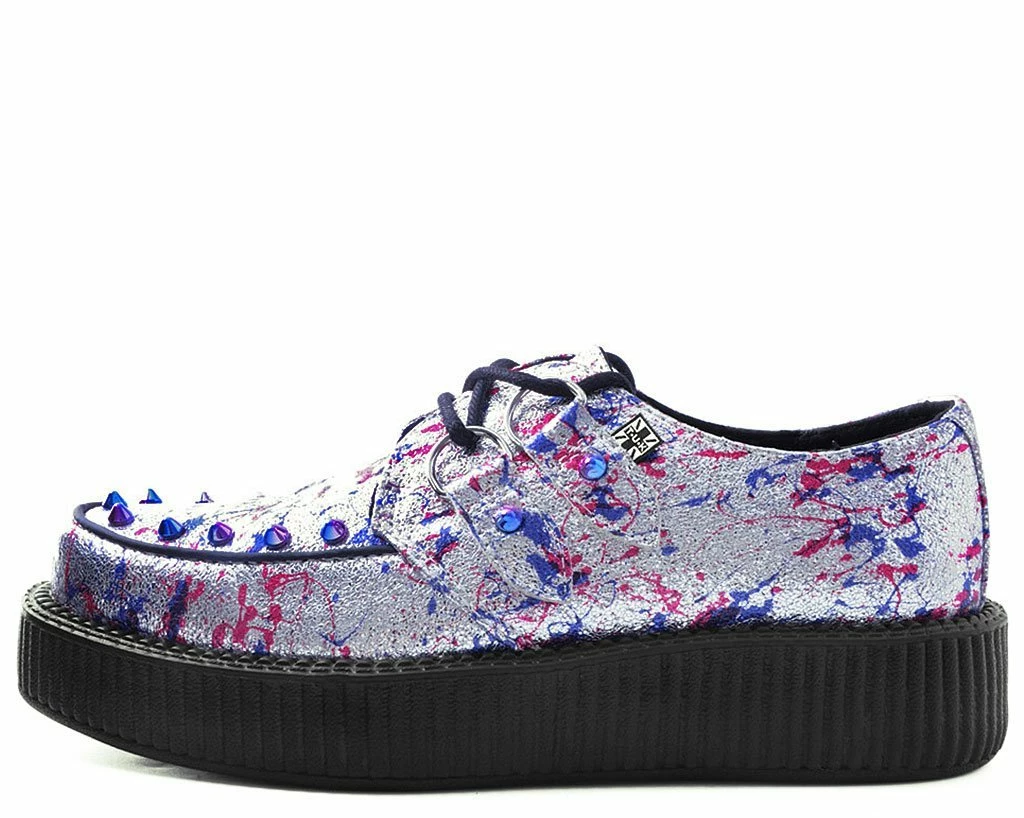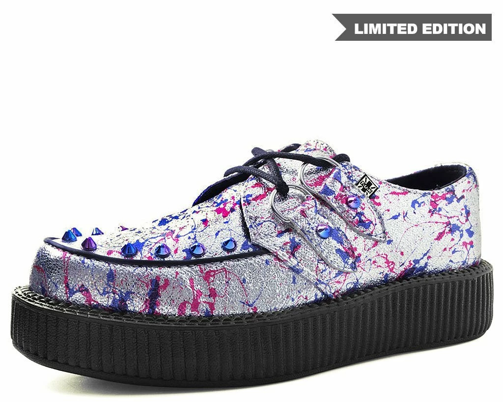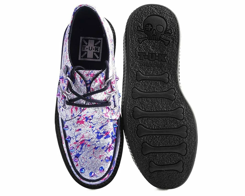 Get in your element with a dose of metal studded style. These limited edition creepers feature a vegan friendly silver metallic upper with an all-over multicolor paint splash design accented with blueish purple spiked studs for an extra finishing touch. Sits on top of our lightweight VIVA low sole design that is about 1 ยฝโ at the heel and ยพโ in the front. Has removable gel insoles for added comfort.