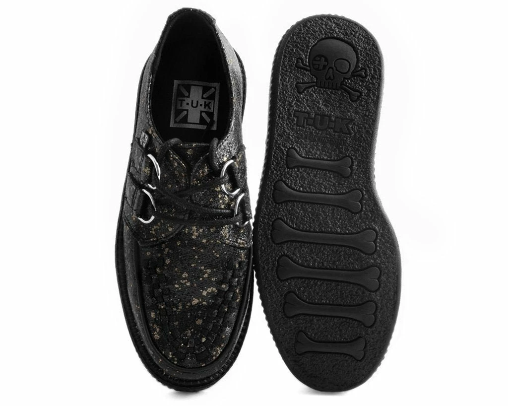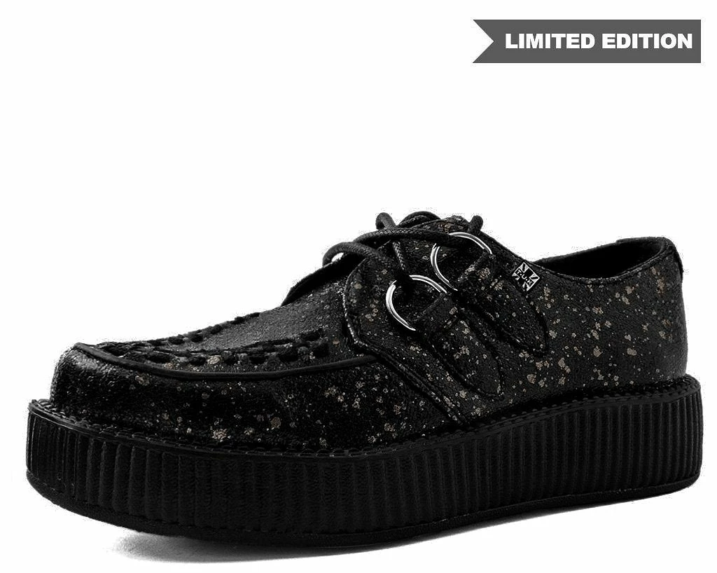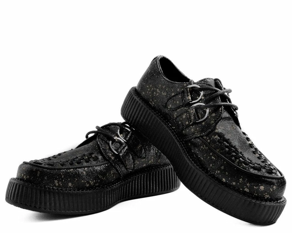 Get inspired with a dose of grunge street style in these limited edition creepers! Features a black vegan friendly microfiber upper with a cool chrome paint splatter design and an all-over subtle reflective metallic finish. Sits on top of our lightweight VIVA low sole design that is about 1 ยฝโ at the heel and ยพโ in the front. Has removable gel insoles for added comfort.