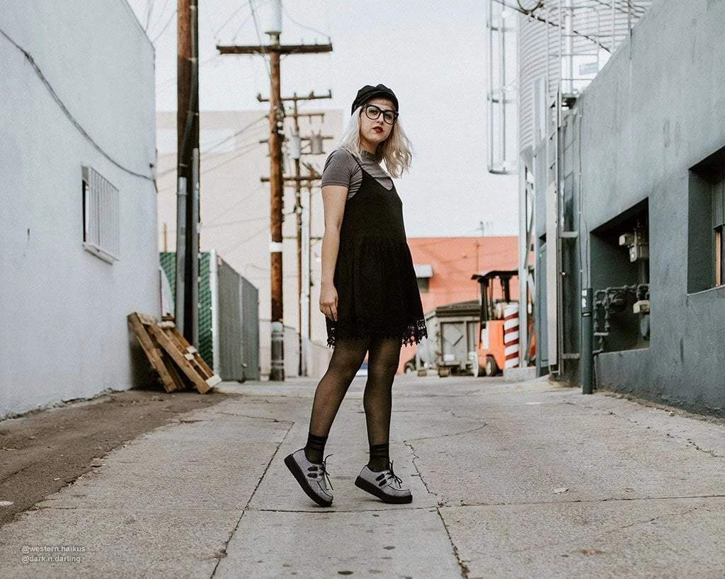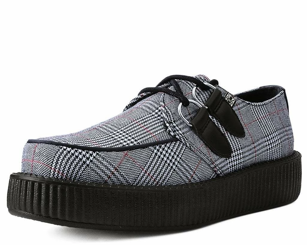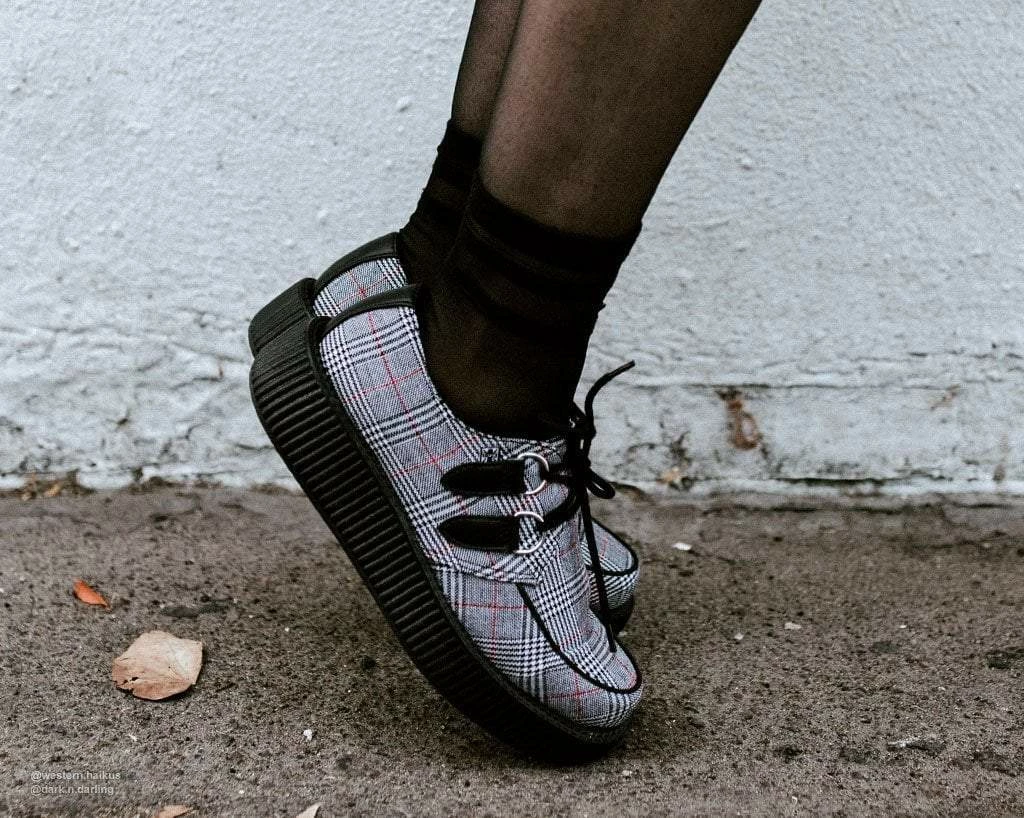 Indulge in your plaid habits with these bad boys. Features a sharp grey plaid pattern fabric upper on our classic round-toe creeper construction. Has a lightweight VIVA low platform sole that measures 1 ยฝโ at the heel and ยพโ in the front. Vegan friendly and has removable memory foam insoles for added comfort.