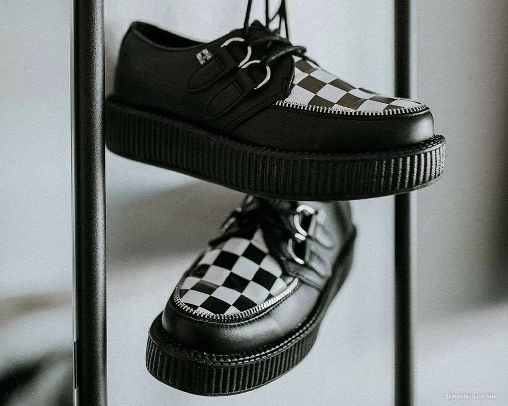 Get ready to live life in the fast lane with these bad boys. Features a black upper contrasted by a checkerboard pattern vamp and zipper trimming for an extra eye-catching touch. Made of our high quality TUKskinโข material โ polishable synthetic faux leather that is both soft and breathable. Has lace-up fastening and our lightweight VIVA mondo sole that has a platform height approximately 1 ยพโ at the heel and 1 ยผโ in the front. Includes removable memory foam padding for extra comfort.